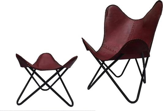 Handmade Leather Arm Chair Cover with Iron Stand and Leather Stool Leather Butterfly Chair Home Decor Rich Brown